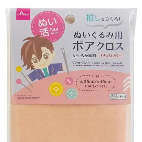 You will need at least two different types of fabric to make your doll.1. For skin, you should buy a 1mm minky/plush fabric. Daiso typically sells this fabric in three different shades (if you are planning to make a tan doll you will have to dye the fabric or source from Aliexpress). DO NOT BUY THE FABRIC WITh THE GIRL MASCOT ON THE PACKAGING (IT IS FURLESS)