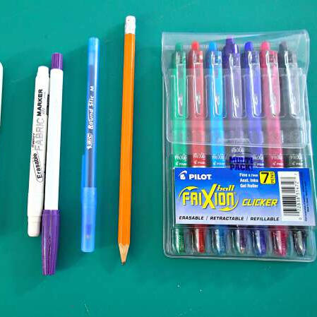 You can use any pen that doesn't bleed/fabric chalk to trace your patterns onto the fabric, but I prefer frixion pens from Daiso. In practice, they've worked the best. If you are working with darker fabric, also consider grabbing a white gel pen.